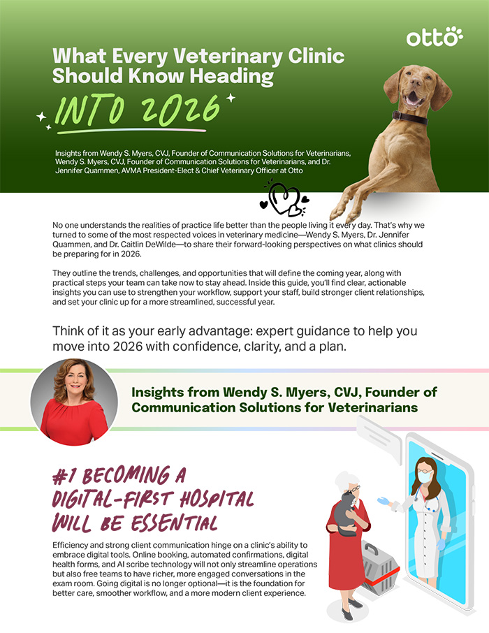 2026 will bring new expectations for efficiency, communication, affordability, and technology in veterinary medicine. This free guide features forward-looking perspectives from Wendy S. Myers, Dr. Jennifer Quammen, and Dr. Caitlin DeWilde to help your team plan confidently.