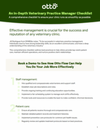 Instead of reacting to chaos, take control with Otto’s Veterinary Practice Manager Checklist – your go-to resource for running a top-performing clinic. From staff management and patient care to marketing and compliance, this checklist covers everything you need to stay organized and deliver exceptional service.
