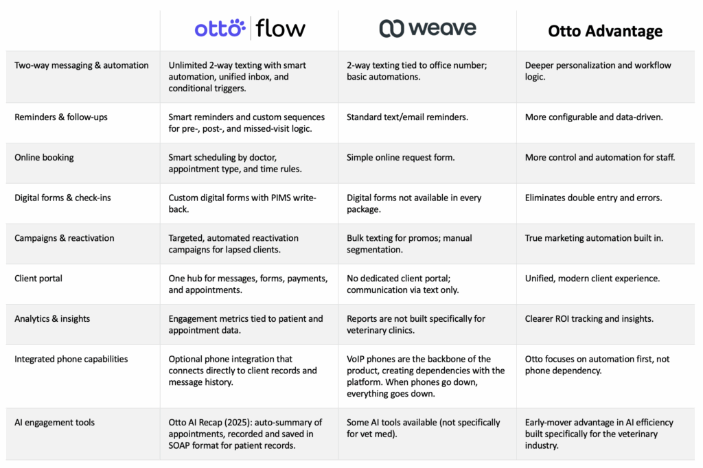 When it comes to client communication, not all platforms are built the same. While Weave is often recognized for its phone-centric tools, Otto Flow was built from the ground up for veterinary workflows, automating repetitive front desk tasks and empowering the team to deliver seamless, coordinated care.